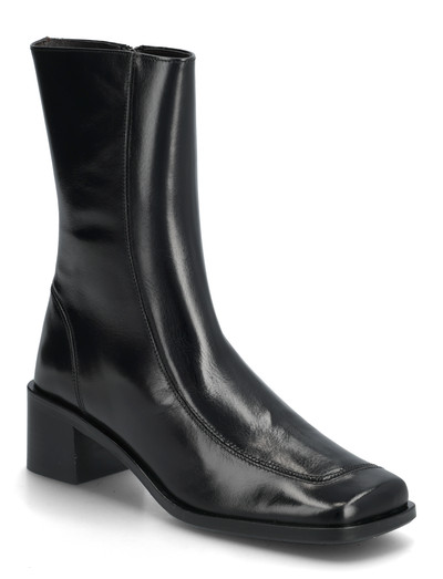 En handgjord design definierar denna stövel, komplett med en modern, fyrkantig tå. Den mellanhöga klacken ger ett subtilt lyft, medan sömnadsdetaljer tillför en konstnärlig känsla.