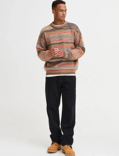 Denna randiga stickade tröja med klassisk rund hals är ett bekvämt och stilfullt alternativ för kyligare dagar. Det horisontella randmönstret ger ett visuellt intresse, vilket gör den till ett mångsidigt plagg för lager-på-lager eller att bära som den är.