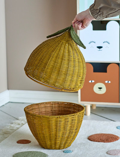 The Sage Basket with Lid by Bloomingville MINI features a cozy design resembling a lemon. This lovely and practical basket provides storage space for all of the child's favorite things, adding a playful and decorative touch to the children's room. The lid is removable, making it easy for little hands to access teddy bears and toys, and to tuck them away again.