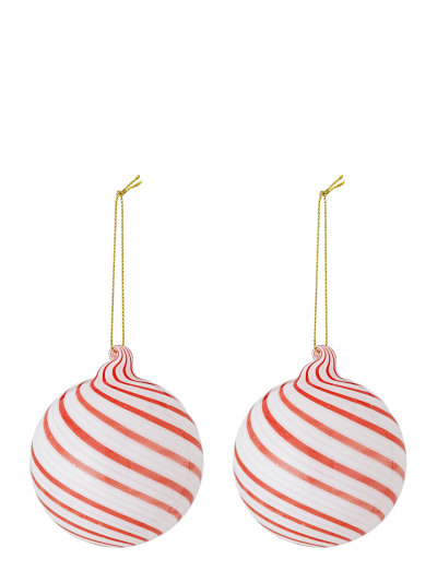 The Zwirl Ornament by Bloomingville consists of two elegant glass baubles with a swirl effect in white and red colors, reminiscent of classic candies. Each ornament is mouth-blown and unique. A fine gold cord for hanging completes its stylish look.