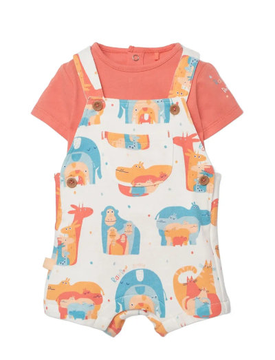 Det här stickade setet har ett lekfullt djurtryck och är tillverkat av mjuk bomull, vilket garanterar en bekväm känsla för din lilla. Designen inkluderar en kortärmad t-shirt som bärs under knäppta hängselbyxor, vilket ger praktisk användbarhet och enkel påklädning. Det här glada setet är perfekt för vardagens äventyr.