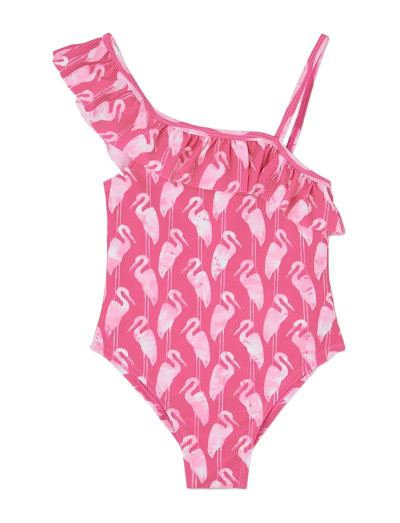 Denna mönstrade baddräkt är perfekt för soliga dagar och erbjuder komfort och rörelsefrihet. Den är tillverkad av elastiskt material och har UPF50 solskydd. En volangdetalj på ena axeln ger en unik touch till detta glada alternativ för dagar på stranden eller vid poolen.
