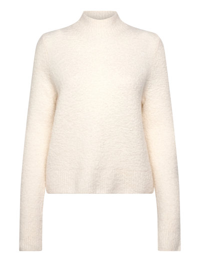 Denna stickade tröja har en hög halsringning som ger en elegant silhuett. De långa ärmarna och den mjuka texturen gör den till ett bekvämt och stilfullt val för kyligare dagar.