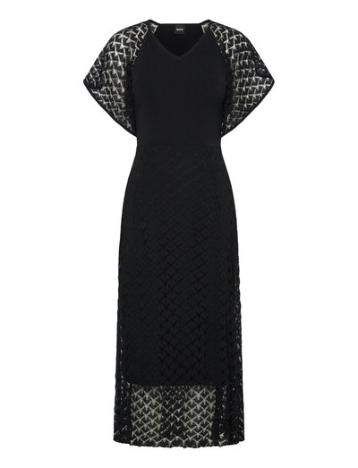 Denna maxiklänning är tillverkad med halvtransparenta ärmar och ger en sofistikerad look för kvällsevenemang. Designen har en V-ringning och en figurnära livstycke som flyter ut i en subtilt mönstrad kjol, vilket skapar en elegant silhuett.