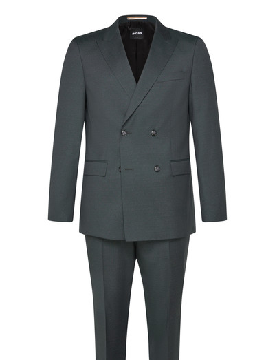 Denna slim-fit kostym är tillverkad av ren ull och erbjuder en modern silhuett med sina skarpa linjer och mjukt konstruerade axlar. Den dubbelknäppta designen har en skårad krage, fickor med lock, helfodring och sidoslitsar, vilket gör den till ett tidlöst tillskott i varje garderob.