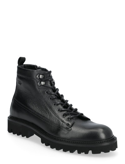 Snörkängor med en robust, räfflad sula som ger ett säkert grepp. Dessa kängor har en texturerad ovandel, metallöljetter och en dragflik baktill för enkel användning.