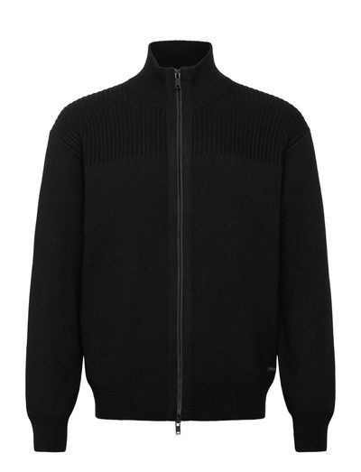 Denna stickade jacka med dragkedja kombinerar texturer med ett ribbstickat halvt ok som kontrasterar mot en slätstickad nedre del både fram och bak. Ärmarna är helt i slätstickning, vilket kompletteras av en dubbel ståkrage och ett stickat dragkedjeband framtill. Resande ribbdetaljer vid den franska axeln sträcker sig till ryggen, framhävs av synliga fully fashion-märken, och ett rektangulärt logomärke sitter strax ovanför fållen.