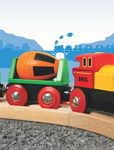 Om du letar efter ett nytt tåg för din järnväg, så har du hittat rätt tåg. Detta batteridrivna tågset är extra kul, med en kolvagn, en roterande cementblandare och strålkastare som lyser upp järnvägen.