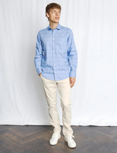 Denna skjorta är tillverkad med en modern passform och har ett raffinerat rutmönster. Designen erbjuder en balans mellan klassisk stil och modern skräddarkonst, vilket gör den lämplig för både professionella och avslappnade sammanhang. Det lättskötta tyget säkerställer en skarp look med minimal ansträngning.