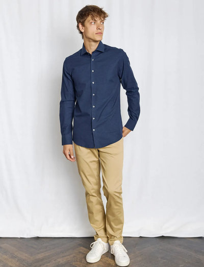 Denna slim fit-skjorta är tillverkad i 100 % bomull melange dobby och ger en elegant silhuett. Den är designad för minimal strykning och har en cutaway-krage, en fransk knappslå med mörkgrå pärlemorknappar och justerbara manschetter.