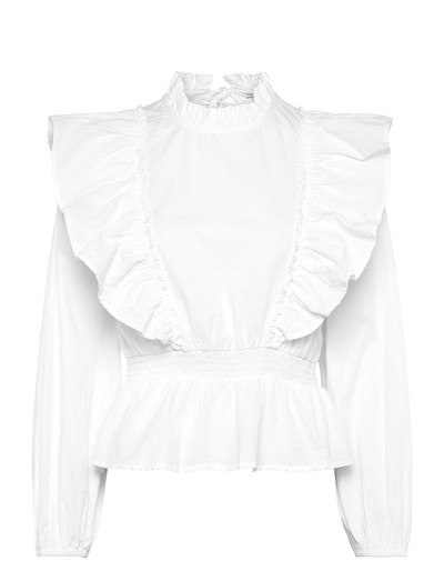 Denna vävda blus har en kroppsnära passform med en rund halsringning med volang och en smockad midja. De långa ärmarna avslutas med elastiska muddar, medan ett knytband i halsen ger en elegant touch.