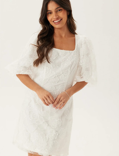 Denna klänning har en fyrkantig halsringning och puffärmar, samt en öppen rygg med knytband upptill. Det lätt stretchiga materialet är fodrat och har en dold dragkedja i sidan.