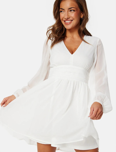 Denna miniklänning har en smickrande silhuett med långa ballongärmar och en V-ringning. Chiffonmaterialet är lätt och luftigt, perfekt för varmare väder. Den har också ett icke-avtagbart knytband och helfodrad.
