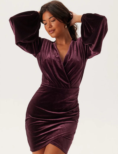 Denna korta klänning är tillverkad i mjuk sammet och har en smickrande omlottdesign upptill och nedtill. Den har en dold dragkedja baktill, stretchigt material och tunna axelvaddar som framhäver silhuetten. Omlottdetaljerna ger en touch av elegans, vilket gör den perfekt för kvällsevenemang.