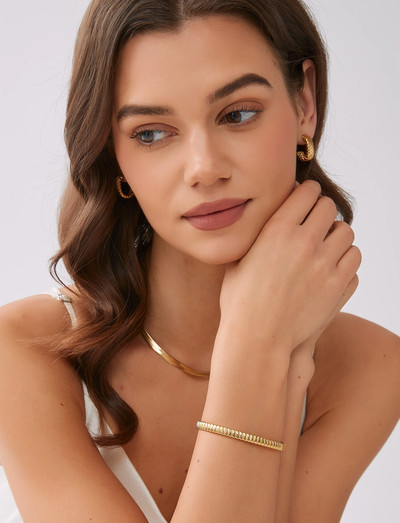 Lyft din handled med detta tidlösa armband, som uppvisar ett distinkt virvlande mönster. Denna accessoar ger en touch av sofistikering till varje ensemble, vilket gör det till ett mångsidigt tillskott till din smyckessamling.