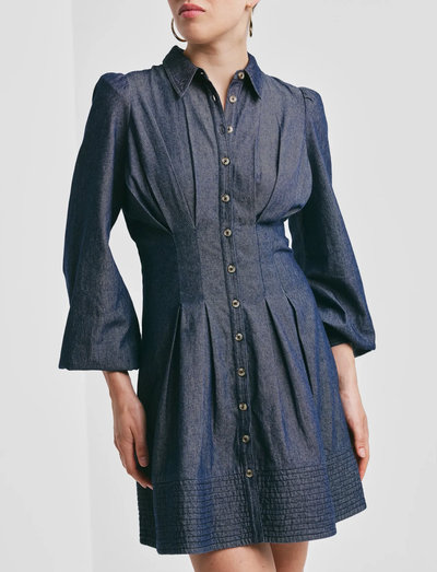 Denna miniklänning är tillverkad i mjuk och lätt stretchig GOTS-certifierad bomullskvalitet och har en skjortkrage och en A-linjeformad kjol. Designen har en figursydd midja, långa ärmar med breda, fyrkantiga manschetter samt plisseringar upptill och på kjolen. Tryckknappar framtill för stängning.