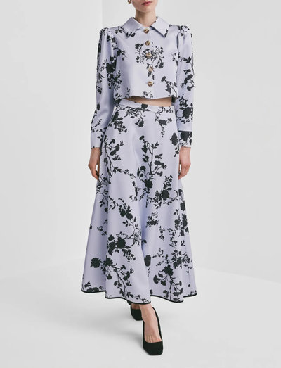 Denna maxikjol är tillverkad av ett strukturerat, glänsande tyg och ger en sofistikerad silhuett. Designad med en bekväm elastisk linning baktill och en diskret sidodragkedja, vilket ger både stil och komfort. Den har mycket volym, vilket gör den till en framträdande del, särskilt när den kombineras med en matchande jacka.