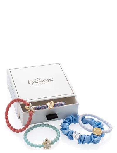 set innehåller: silver heart silk scrunchie sky blue, turtle mint, gold, palm white , starfish coral ,metallic gold heart coral reef