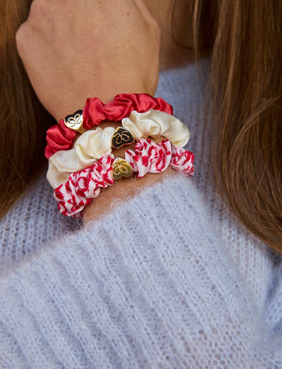 Detta set med tre silkescrunchies är en omtänksam gåva eller en speciell behandling för dig själv. Varje scrunchie är prydd med en signaturberlock i guld, vilket ger en touch av lyx till varje frisyr eller som en elegant accessoar runt handleden. Setet erbjuder en blandning av lekfulla och eleganta stilar.