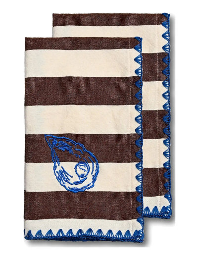 Bubba servett i creme och brunt för tankarna till Sydeuropas dukningar – där klassiska ränder möter koboltblå ostronbroderier i en lekfull kontrast till den eleganta designen. Laskade kanter och noggrant utformade detaljer gör servetten till ett charmigt inslag vid bordet. Matcha med bordsduk och kökshanddukar i samma serie för en enhetlig känsla. Mått: 45x45 cm. (70% återvunnen bomull och 30% återvunnen polyester). Tvättas i 40 grader. Levereras i 2-pack, med band och rosett. Design Byon Studio.