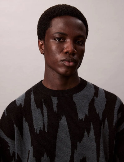 Denna tröja med rund hals har ett genomgående abstrakt jacquardmönster som ger en distinkt look. Den långärmade stickade tröjan ger värme och komfort, vilket gör den till ett mångsidigt tillskott i varje garderob.