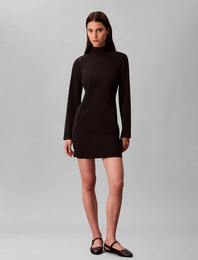 Denna miniklänning har en strömlinjeformad silhuett med en sofistikerad polokrage och långa ärmar. Crepe-tyget faller vackert och gör den idealisk för både dag- och kvällsbruk.