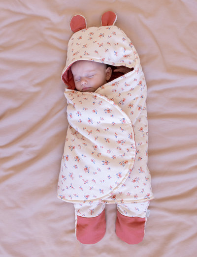 Supermjuk och härlig hooded swaddle med ben med söta björnöron och vackert tryck. Swaddle har ett tunt foder som ger extra värme och komfort. Svaddade barn tenderar att känna sig mer tillfreds, somna snabbare och gråta mindre. Perfekt för nyfödda och bebisar upp till 5 månader. Tryckt swaddle i färgerna gräddvitt och blått.