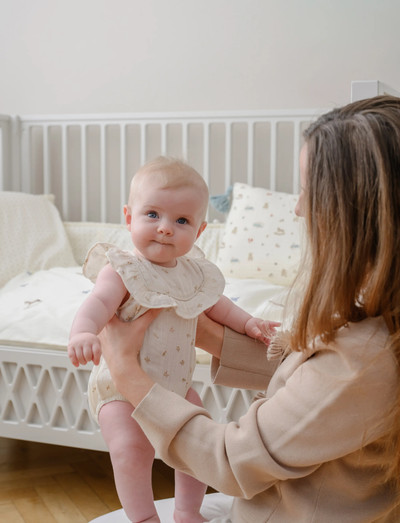Denna romper har ett charmigt tryck med rosetter och hjärtan och är tillverkad av en mjuk, ekologisk linneblandning. Den har en bekväm och rymlig passform som är perfekt för aktiva småttingar. Med volangärmar, ett rynkat ok och elastiska benslut kombinerar den stil och praktisk användbarhet. Knappar baktill och tryckknappar i grenen säkerställer enkla byten. Detta lätta och luftiga plagg är perfekt för både avslappnade dagar och speciella tillfällen. Använd den lager på lager med en kofta och strumpbyxor under kallare dagar.