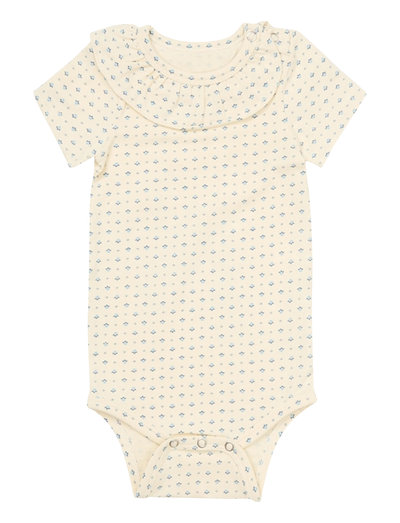 Den här kortärmade bodyn har ett sött båge- och hjärtmönster. Den har en volangkant vid halsen och en tryckknappslåsning i grenen. Bodyn är gjord av mjuk och bekväm ekologisk bomull.
