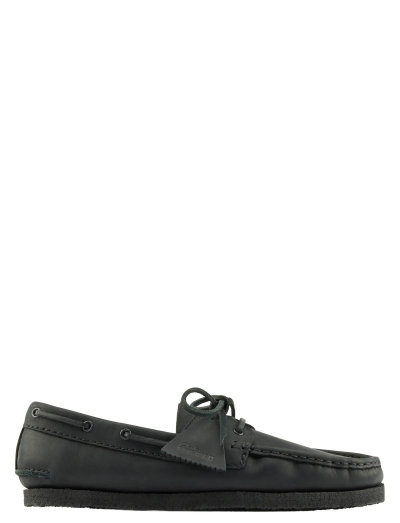Inspirerad av båtskor från arkivet har denna mockasinkonstruerade sko en handsydd Wallabee-stil förklädessöm. En utformad stussöm omger den bakre hälen, medan fyrkantiga lädersnören och metallöljetter fulländar den exklusiva känslan. Den flexibla, släta krepade yttersulan säkerställer bekväm användning.