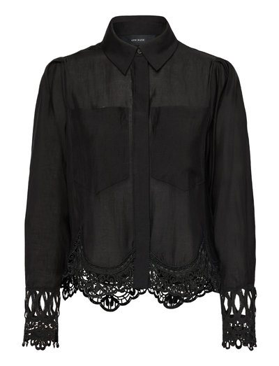 Denna croppade skjorta är tillverkad i ett premiummaterial och har långa ärmar samt en distinkt spetskant längs fållen och manschetterna. Designen innehåller klassiska skjortelement, vilket ger en blandning av traditionell skrädderi och modern stil.