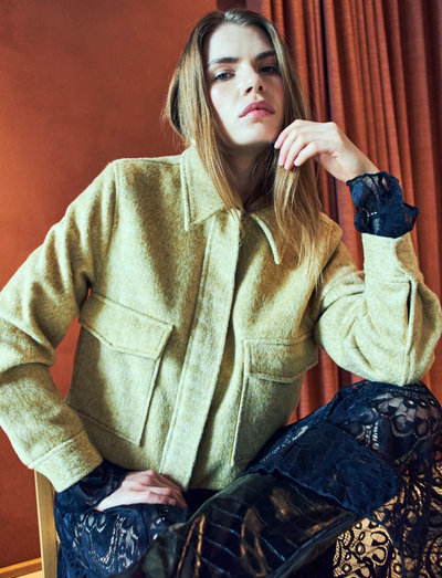 Denna jacka har en krage och fickor med lock framtill, vilket ger både stil och praktisk användning. Den korta längden gör den mångsidig för lager-på-lager.