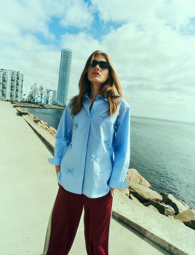 Denna långärmade skjorta är tillverkad i ett premiummaterial och har en dold front för en elegant och minimalistisk look. Designen förstärks med fina rosettdetaljer, vilket ger en lekfull sofistikering till denna klassiska silhuett.