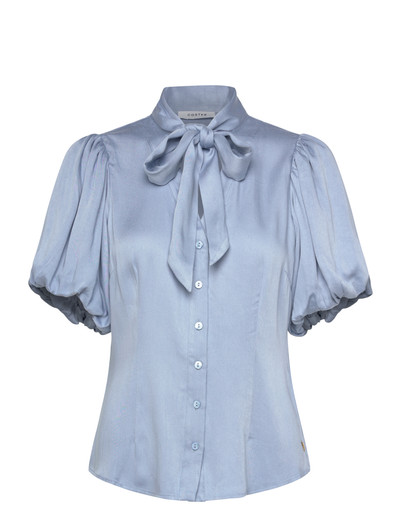 Volymärmar och en bandkrage definierar denna eleganta blus. Den figursydda designen har en knappstängning framtill, vilket skapar en sofistikerad silhuett. Perfekt för både vardag och fest.