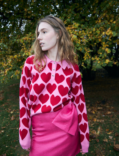 Denna stickade tröja har en klassisk polokrage och ett lekfullt hjärtmönster, vilket ger en charmig twist till en basgarderob. Avslutad med en treknappslå, är det ett bekvämt och stilfullt val för vardagsbruk.