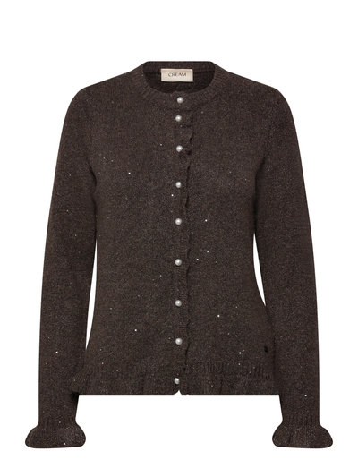 Fina volanger pryder ärmsluten och nederkanten på denna mjuka stickade kofta. Den är mångsidig och kan användas i lager på lager, med knäppning framtill och subtilt skimmer.