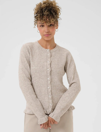 Fina volanger pryder ärmsluten och nederkanten på denna mjuka stickade kofta. Den är mångsidig och kan användas i lager på lager, med knäppning framtill och subtilt skimmer.