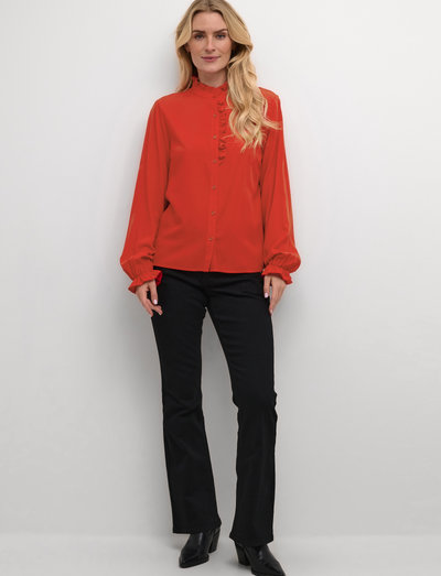 CRVenea-skjortan är en elegant och feminin skjorta med vackra detaljer. Den har en volangprydd mandarin-krage och volanger som sträcker sig ner längs knappslå. Skjortan har en knappslå framtill och voluminösa ballongärmar med en volangkant.