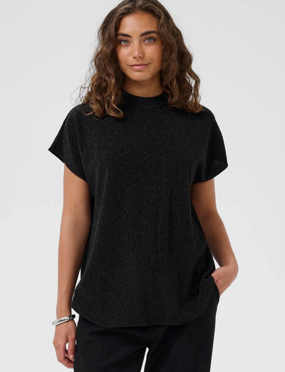 Denna topp har en subtil glans som ger en touch av diskret elegans. Den är designad med korta, cap-ärmar och en hög halsringning, vilket gör den mångsidig för olika tillfällen.