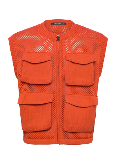 Denna stickade väst i ren bomull har en avslappnad, croppad silhuett. Den har en rund hals, en dragkedja fram och fickor med distinkta sköld-dragkedjor. Stitchdetaljer och en präglad läder/PU-etikett fulländar designen, vilket gör den idealisk för lager-på-lager.