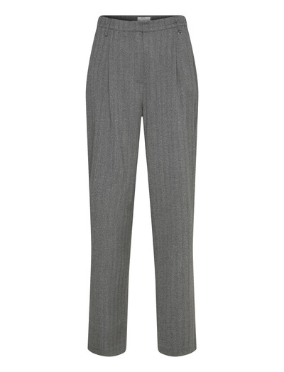 Dessa fiskbensbyxor är skräddarsydda med en avsmalnande passform som ger en sofistikerad silhuett. De har veck framtill, sidfickor och en bekväm elastisk linning baktill. Byxorna kan stylas som en kostym med en matchande kavaj eller nedtonas med stickat.