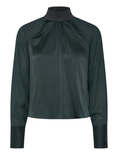 Denna eleganta topp är tillverkad i en sidenmix och har en hög halsringning och långa ärmar. Designen har fina rynkdetaljer framtill och stilfulla manschetter med knappar. Bär detta mångsidiga plagg med skräddarsydda byxor eller dina favoritjeans för olika tillfällen.