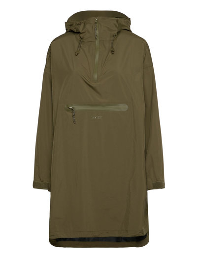 Functional rain anorak with an adjustable hood and storm brim. It features a front pocket with a waterproof zip, as well as a waterproof front closure with a dart detail that makes it easy to take on and off. Velcro at the cuffs and sporty cord details complete the design. With taped seams and a 10,000 mm waterproof rating, it offers reliable protection. When not in use, the anorak can be packed into its own pocket and carried as a messenger bag.