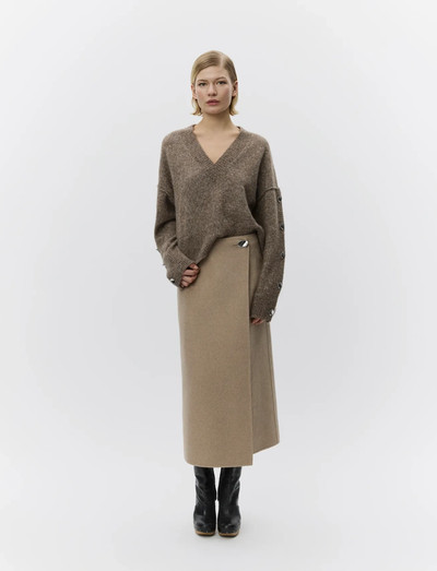 Denna kjol är tillverkad av dubbelsidigt ulltyg och ger en sofistikerad silhuett. Dess midilängd och subtila omlottdesign gör den till ett mångsidigt tillskott till varje garderob, lätt att styla för både avslappnade och formella tillfällen.
