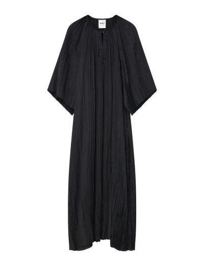 Denna midiklänning är tillverkad med en krinklad yta och har en avslappnad silhuett. Den har korta raglanärmar och en rå fåll för en touch av ledig stil. Framsidan har en knappstängning med en nyckelhålsöppning, vilket ger en subtil detalj.