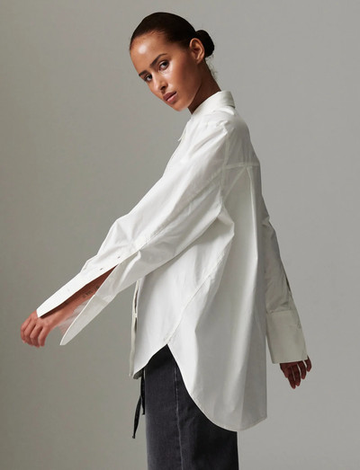 En krispig, klassisk look definierar denna skjorta med knäppning, komplett med en broderad logotypdetalj. Den rundade fållen och de stora manschetterna ger en modern touch. Bär den med jeans eller en kjol för en tidlös stil.