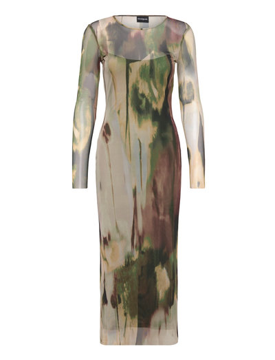 Denna långärmade stickade klänning har en figurnära silhuett. Det halvtransparenta materialet skapar en delikat lager-på-lager-look, perfekt för att ge din outfit djup.