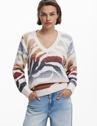 Denna stickade tröja har ett djärvt och iögonfallande mönster som ger en konstnärlig touch till varje outfit. V-ringningen ger en smickrande silhuett, vilket gör den till ett mångsidigt tillskott till din garderob.