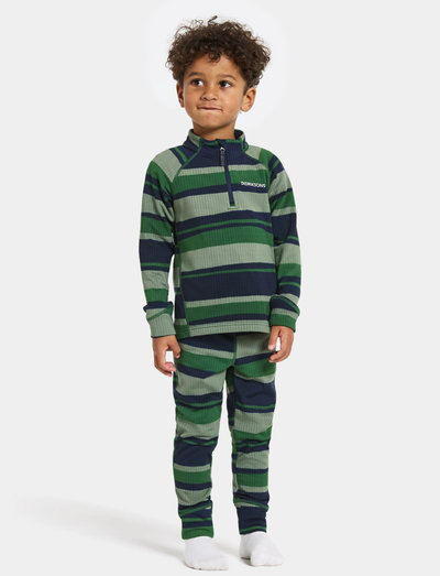 Detta set har en randig design och inkluderar en långärmad tröja med en kvart dragkedja i halsen och matchande leggings. Den elastiska midjan säkerställer en åtsittande och bekväm passform, vilket gör den idealisk för aktiva barn.