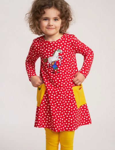 En mjuk och mysig Pippi klänning för barn. Den A-linjeformade klänningen har långa ärmar, rund halsringning och påsydda fickor med dekorationsknappar i kjoldelen. Produkten innehåller certifierad ekologisk bomull.